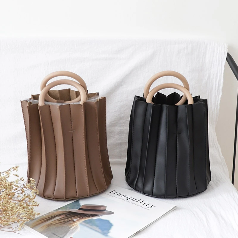 Promo BEAU-Vintage Three-Dimensional Pleated Bucket Bag Wooden Ring Top Handle Women Handbag Designer Cro